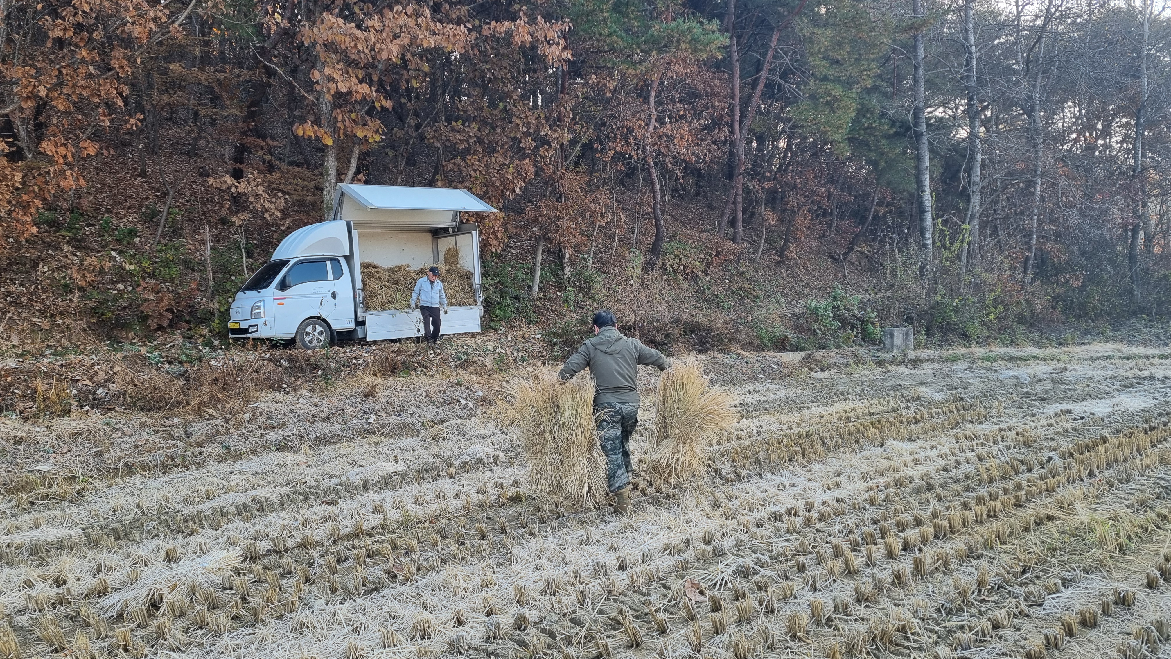 08:35 고산농장 후면 입구쪽에서 구입한 볏짚을 이웃을 통하여 옮기기