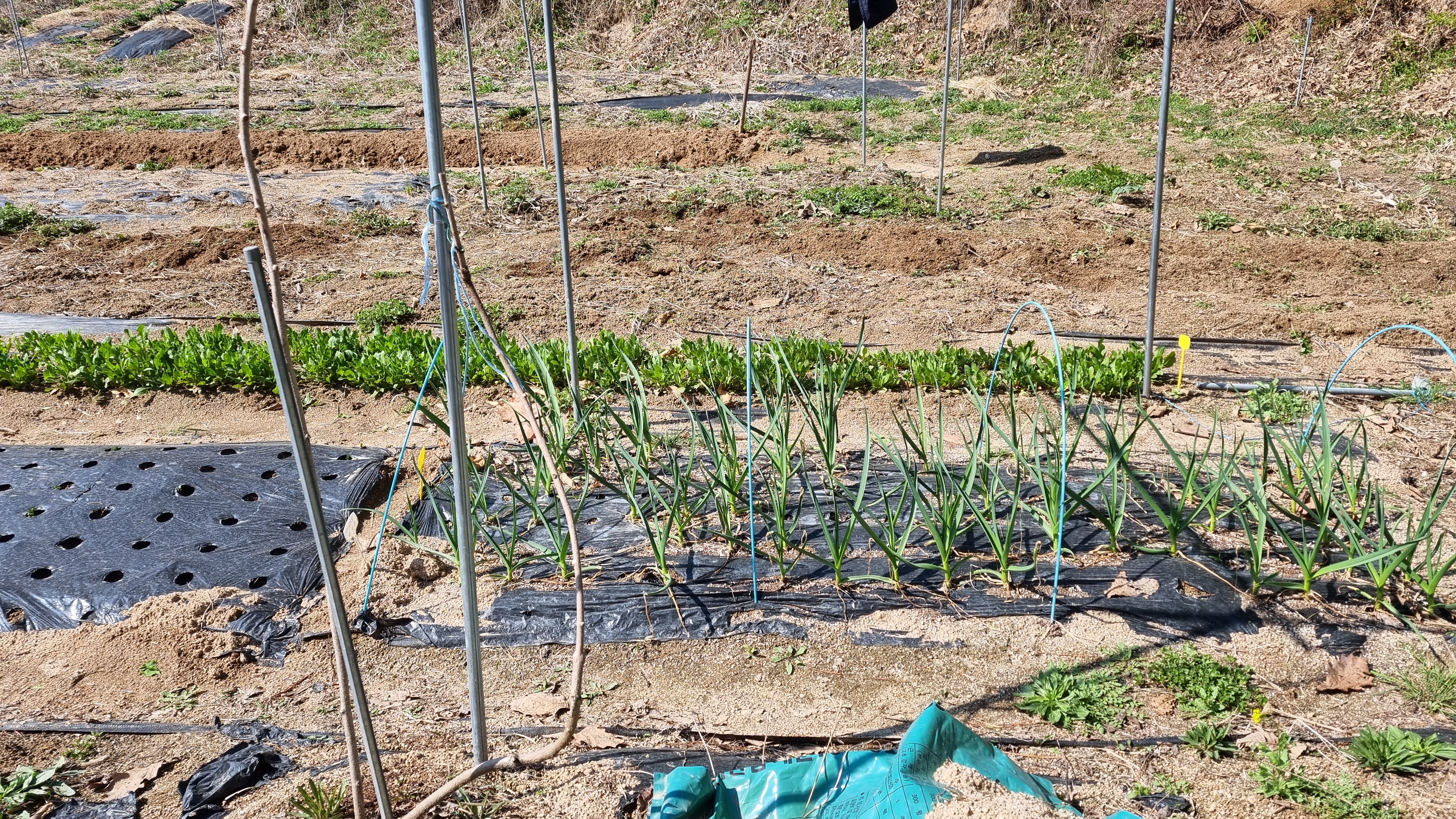 봄채소 재배를 위하여 빈 이랑에 석회고토를 뿌리고 뒤집기